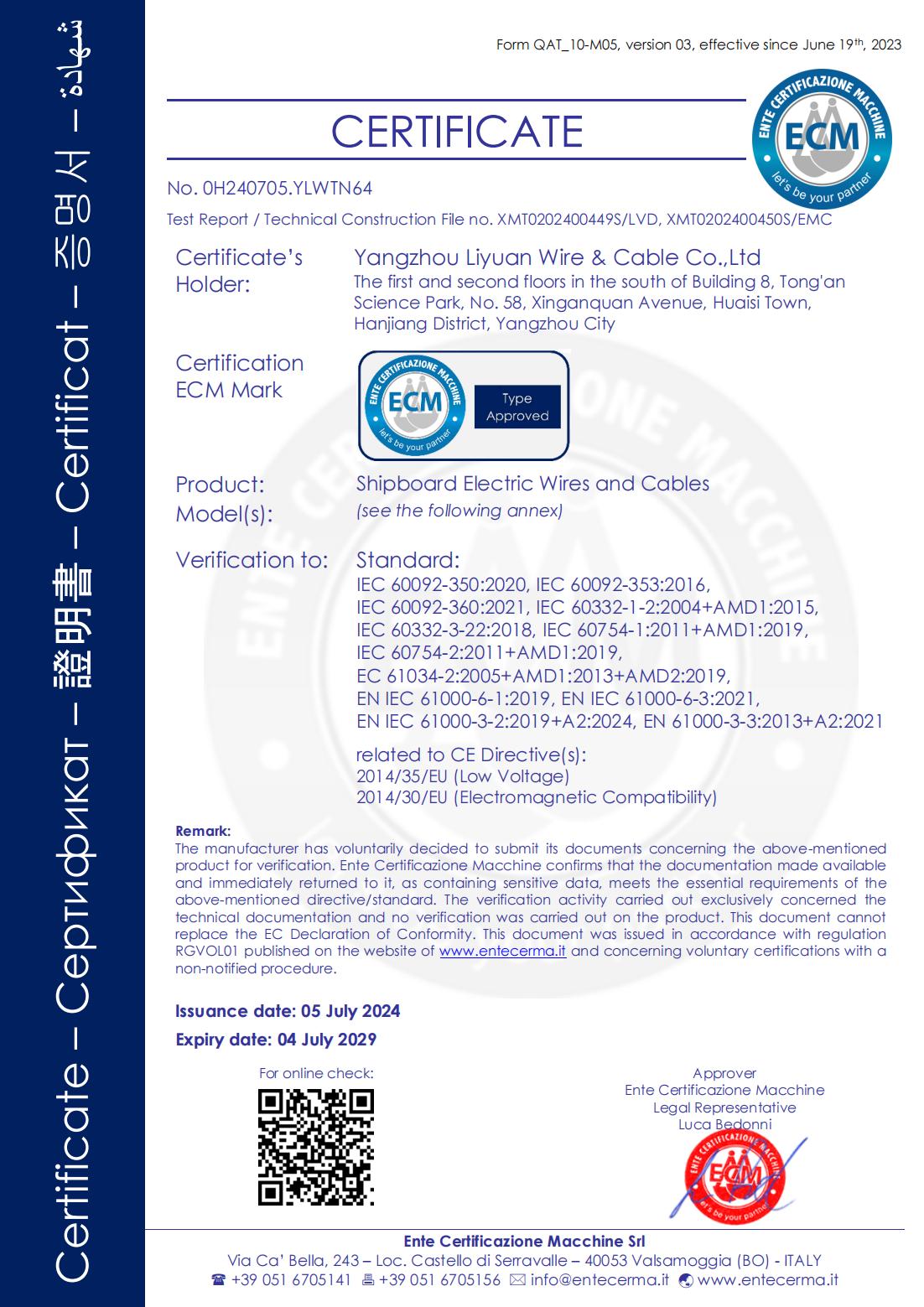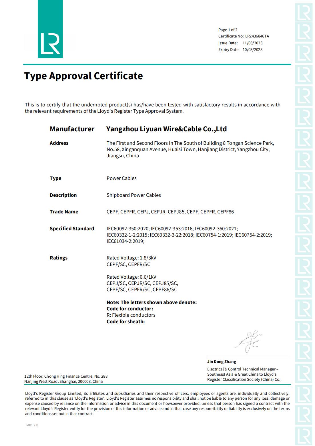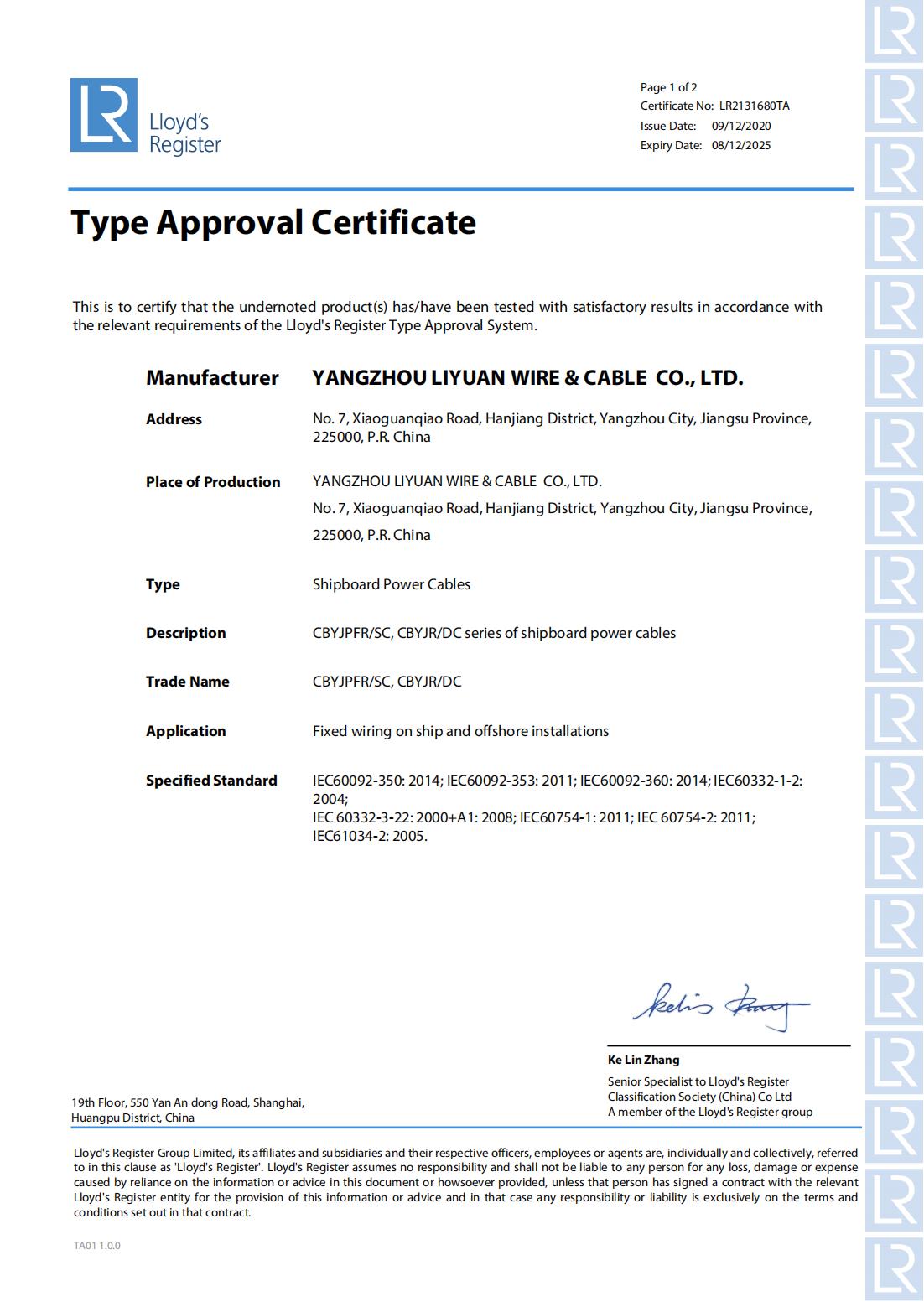 СЕРТИФИКАТ КЛАССИФИКАЦИОННОГО ОБЩЕСТВА LR