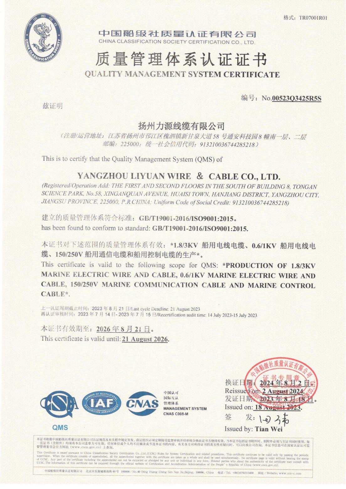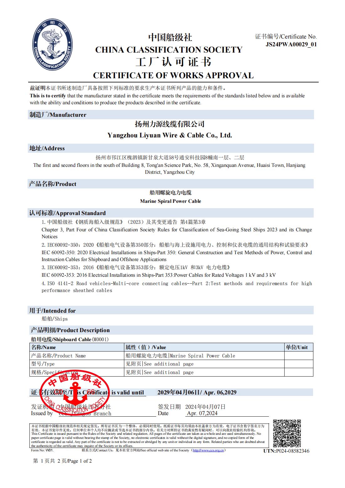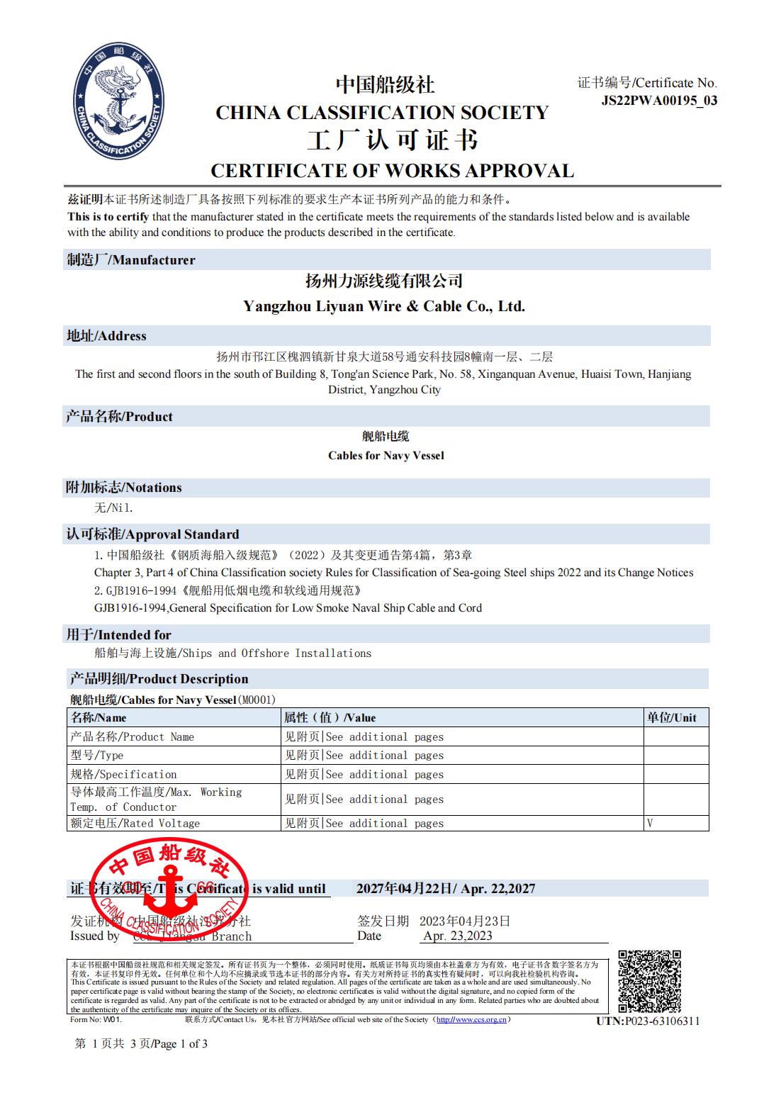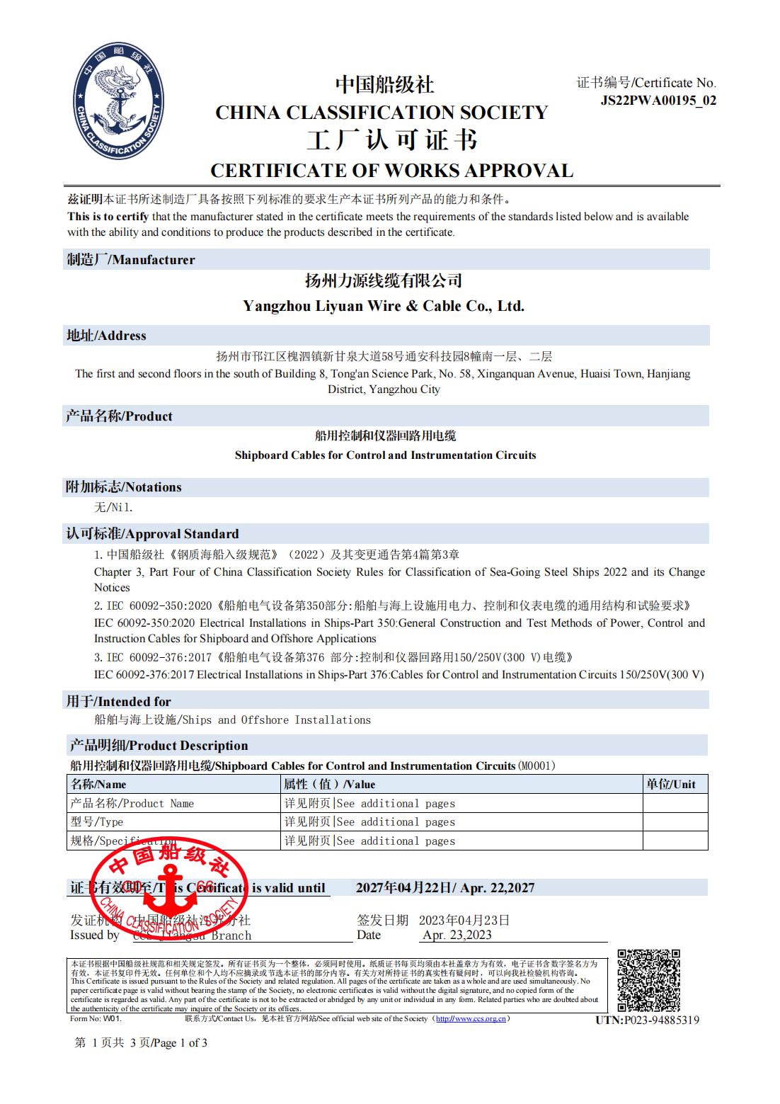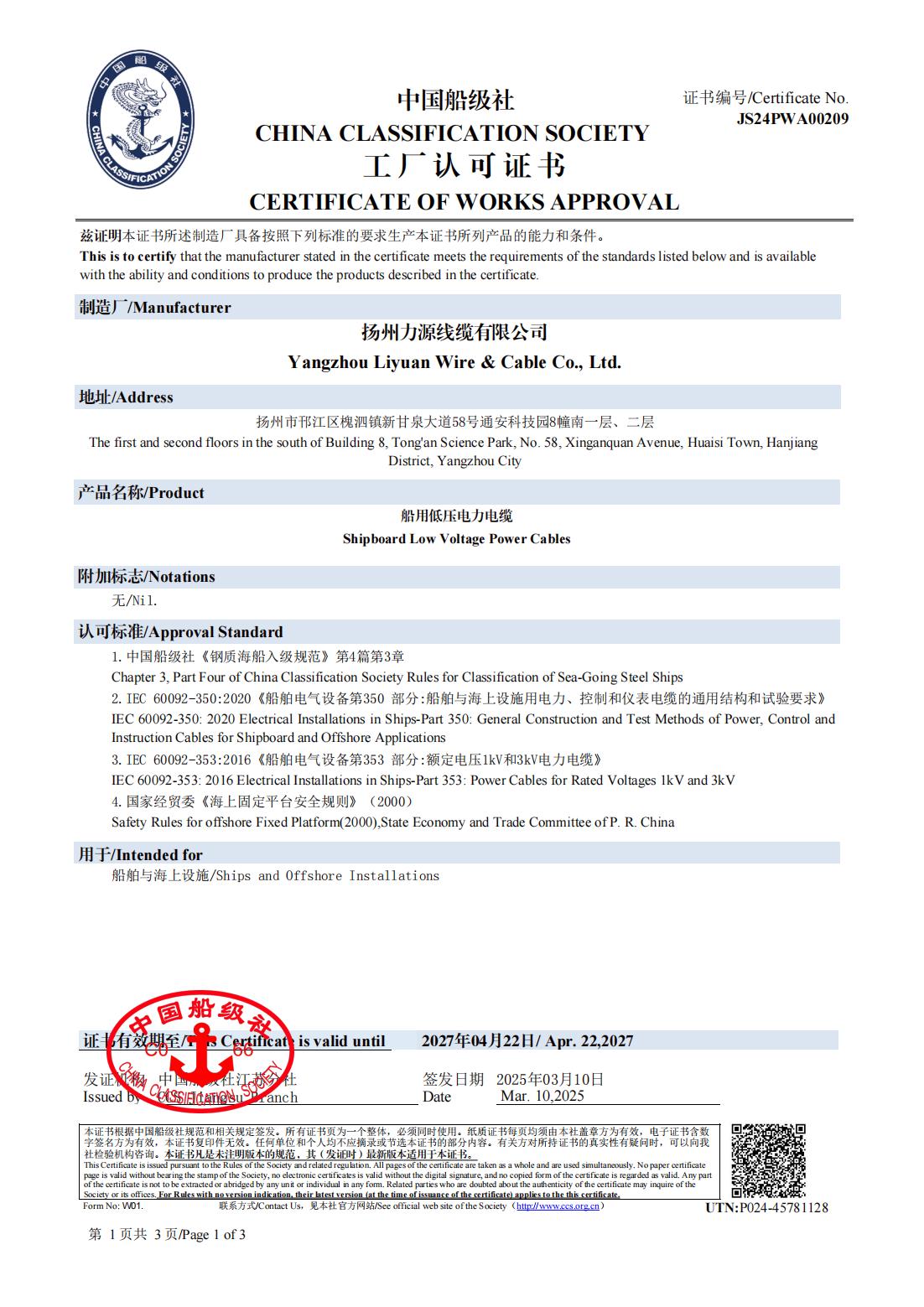 СЕРТИФИКАТ КЛАССИФИКАЦИОННОГО ОБЩЕСТВА CCS КИТАЯ